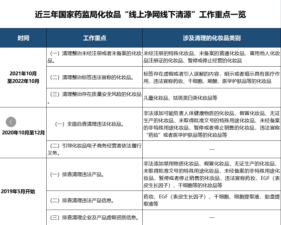 青眼梳理近三年來,國家藥監(jiān)局“線上凈網(wǎng)線下清源”專項行動的工作重點發(fā)現(xiàn),前兩年,此專項行動主要以清理違法產(chǎn)品的信息以及排查清理企業(yè)及產(chǎn)品虛假資質(zhì)信息、排查清理違法產(chǎn)品為主,而今年則主要以清理整治各類違規(guī)的化妝品為主。